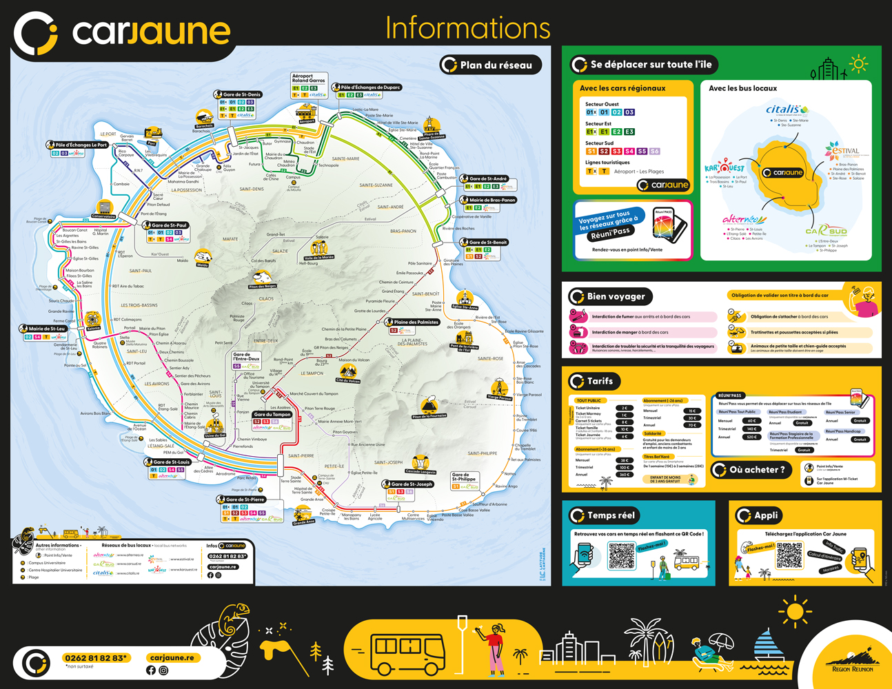 En juin dernier, Latitude-Cartagène a été sollicité par le groupement CAP’RUN pour repenser et produire l’intégralité de l’Information Voyageur de Car Jaune le réseau régional de l’île de la Réunion. Une aventure intense et riche en apprentissage qui nous a emmené à l’autre bout du monde.